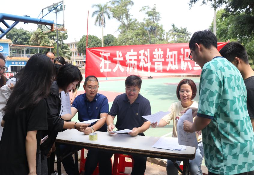老师和员工们在活动现场拉起了“狂犬病科普知识宣传”字样的醒目的横幅,准备了足够的宣传单。宣传单上就狂犬病的概念、潜伏期、传播途径、临床症状及防治等相关问题给出了详细的解释。并且在宣传单底部附上湛江市疾病预防控制中心联系方式,可对注射狂犬疫苗相关内容进行咨询。员工们对本次宣讲内容非常感兴趣,围着老师认真聆听和询问。有同学表示,通过阅读宣传资料和咨询,他们对狂犬病有了进一步的认识,会与身边的好友和家里人分享这次的收获。