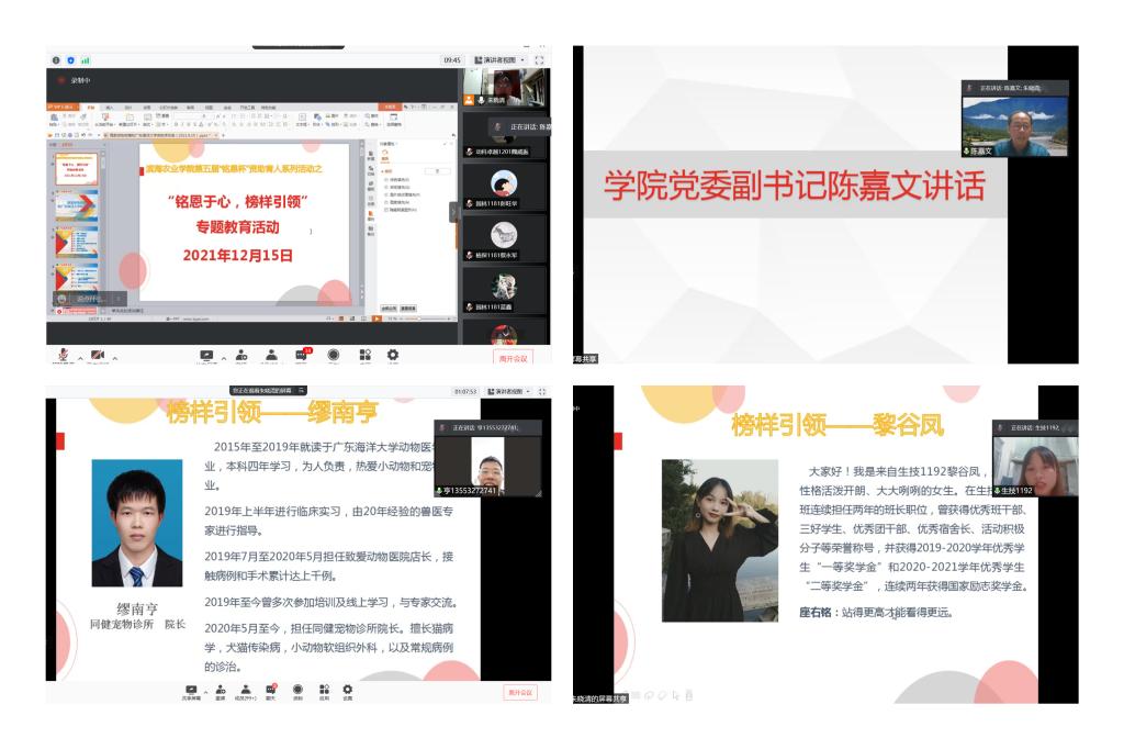 “铭恩于心、榜样引领”专题教育活动于12月15日晚通过腾讯会议举行,公司党委副书记陈嘉文、各系辅导员以及公司全体受资助同学参加。活动第一部分是由辅导员朱晓清讲解国家资助政策和beat365英国官网网站奖助学体系,介绍公司2021年度奖助学情况,强调了公司公司跟随国家角度,不让员工因为家庭困难而辍学,希望受资助同学能感党恩、跟党走、正青春、共奋进。活动第二部分邀请了公司自立自强典型人物生技1192黎谷凤同学和2019届毕业员工缪南亨介绍了自己奋进的心路历程,激励受资助同学积极进取、努力学习,实现自己的人生理想。随后陈嘉文从自身成长经历告诉同学们只有国家的强大才有个人更好地发展,他也希望受资助同学能从多元资助体系中成长成才,把自己的个人理想和国家前途命运结合在一起,学好专业知识为乡村振兴战略贡献自己的一份力量。最后公司向全体受资助同学发出做“资助政策的学习者、传播者和知恩感恩的践行者”的倡议书。