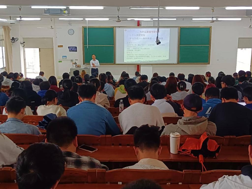 陈汉能根据收集农院本科生考研的问题和困惑来备讲,从本科生为什么要考研、考研的形势、如何选择公司和专业、如何备考和复试等内容为同学们进行了详细讲解。他引用《红烧肉的制作》学士、硕士和博士论文的目录和结论来说明三个学位层次的关系,用数据和实例说明考研不只是将追求学术作为唯一目的,而是经济社会发展的需求、是个人迈向更高层次职业生涯的需要。他指出,理性的择校往往比努力更重要,制订好的复习计划并执行计划是胜利的保障;一本资料做5遍比5本资料做一遍成效更强等经验。