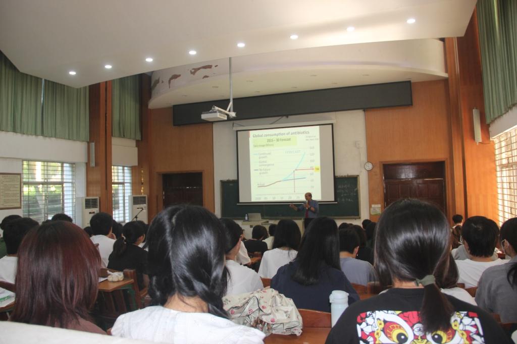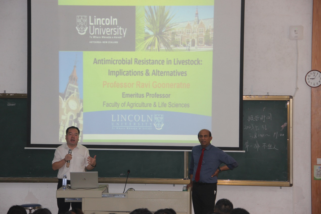 2023年5月31日上午,新西兰林肯大学终生教授Ravi Gooneratne博士和新西兰奥塔哥大学教授Alaa El-Din博士受邀在兴农楼109为beat365英国官网网站师生作学术报告。Ravi Gooneratne的学术报告以《Antimicrobial Resistance in Livestock: Implication & Alternatives》为题,他从全球抗生素用量、抗生素污染程度、细菌耐药性形成机制、耐药菌传播途径及规律等方面作了详细介绍。Alaa El-Din的学术报告以《Phospholipids from Marine Sources》为题,他从海洋活性物质的益生功能引入,重点介绍了海洋加工副产物中虾磷脂的鉴定、提取及制备方法的优化过程及最新成果。动物医学系和动物科学系部分青年教师、研究生及“卓越班”员工约150参加会议,报告会由动物医学系主任巨向红教授主持,beat365英国官网网站副经理马驿教授致欢迎词。