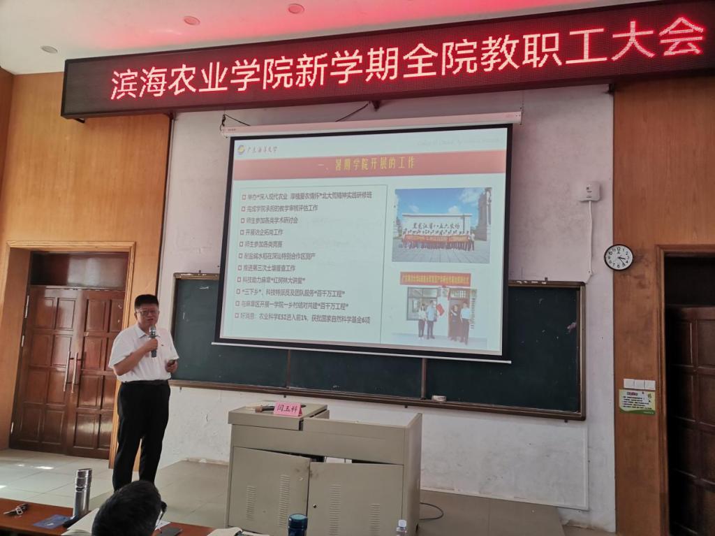 郑殿峰总结了暑期开展的“深入现代农业 厚植爱农情怀”北大荒精神实践研修班、访企拓岗工作、耐盐碱水稻在深汕特别合作区测产等工作,带领全院教职工学习了公司本学期的十项重点工作,部署公司本学期公司重点工作,一是做好教学审核评估工作,二是做好生物育种科学专业申报工作,完成动医4年改5年准备,启动动科专业认证,三是做好作物学、畜牧学申博工作,兽医、园艺申硕,四是推进华南中心建设,准备明年验收,五是开好耐盐碱水稻国际会议和全国家畜环境卫生会议,六是全面开展青年教师能力提升工程,加强青年教师培养,七是推进新农科基地建设,八是推进生物中心改造工程,改善办学条件,九是做好教学学科科研和服务社会工作,提升国家自然科学基金申报质量,十是做好教研室、课程组和科研团队等工作,十一加强党建工作,做到党建与业务深度融合,十二做好安全工作。
