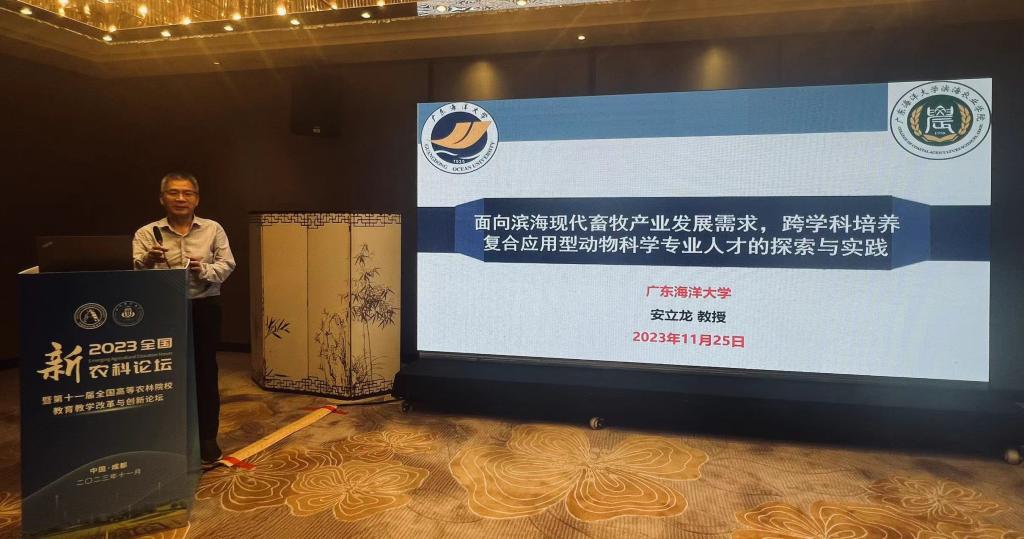 公司教育部新农科改革与实践项目负责人、国家一流专业动物科学专业负责人安立龙教授、动物科学系系主任尹福泉教授和青年教师马健博士出席了本次论坛。安立龙教授应邀作了题为“面向滨海现代畜牧产业发展需求,跨学科培养复合应用型动物科学专业人才的探索与实践”的大会报告,介绍了公司动物科学专业积极应对畜牧业工业化、生态化、数字化、产业化、规模化发展挑战,立足湛江滨海现代畜牧业高质量发展对人才培养的需求,充分利用公司综合性大学多学科优势,跨学科培养“一专多能”复合应用型人才的探索与实践。