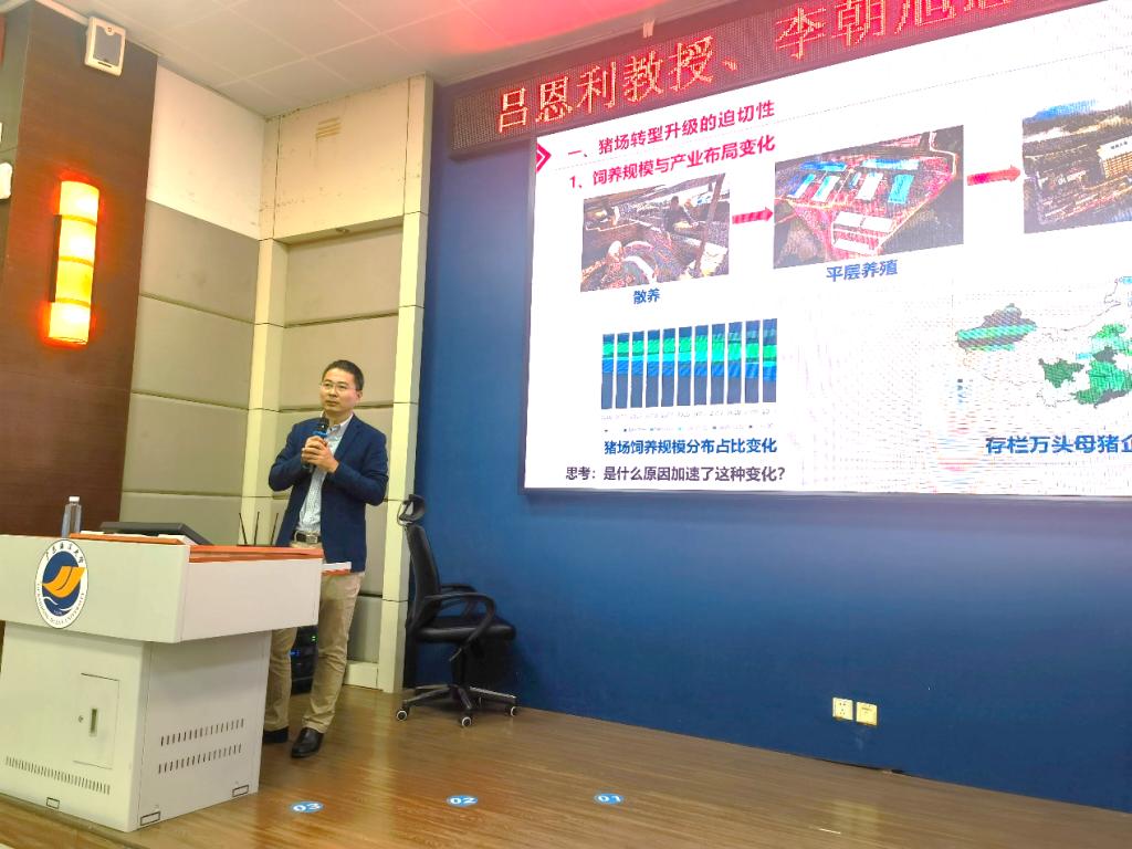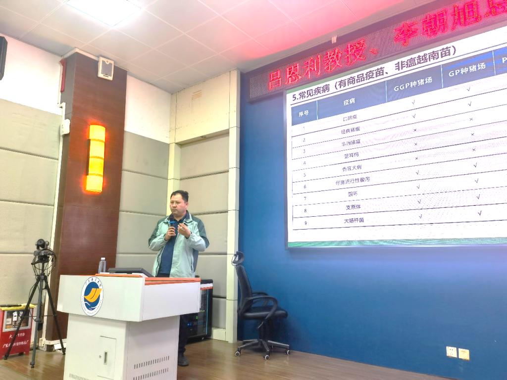 吕恩利教授以“智能化猪场的发展现状与思考”为题,重点阐述了我国生猪产业养殖模式的变迁、智能化养殖技术的应用现状及智能猪场的未来趋势,并对智慧养殖技术赋能生猪产业和保障食品安全的关键环节及存在问题进行了详细剖析。李朝旭总监则以“规模猪场疫病流行现状、趋势及防控难点”为题,介绍了猪场重要疫病的流行特点、防控技术应用现状及存在的主要问题。报告结束后,在场师生与报告人就非洲猪瘟、蓝耳病及流行性腹泻的防控技术进展进行了热烈讨论。