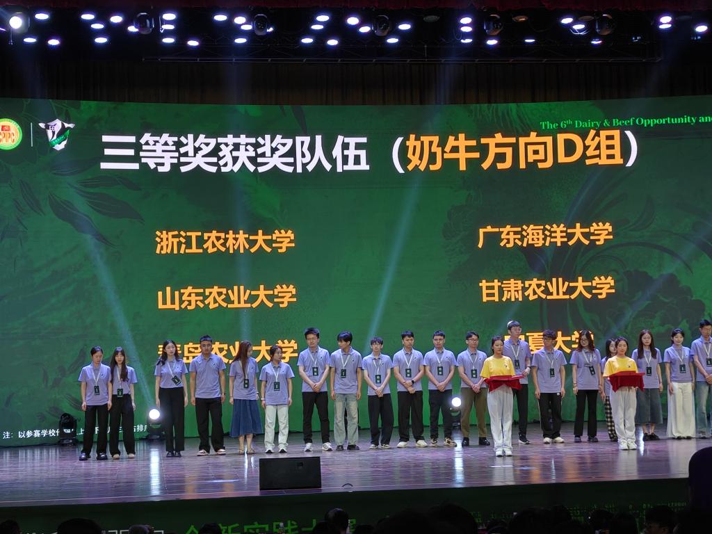 聚焦奶牛和肉牛养殖领域的理论与实践操作,设置了丰富的竞赛环节。通过理论考核、实操评估与现场答辩三大模块,全面考察参赛选手从养殖基础到管理决策的全流程综合能力。公司肉牛队(李涛、郑隆清、廖洁、苏梦容;指导教师:马健、尹福泉)和奶牛队(周焱龙、区钊明、劳蔼鸿、陈冠宜;指导教师:杜春梅、于海滨)分别荣获全国二等奖和三等奖。
