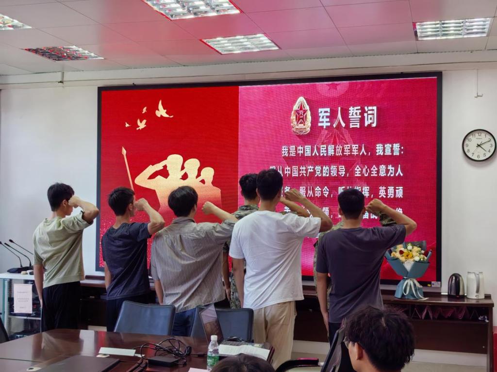 仪式现场,退役班班长梁庭珲带领刘志远和退役在校生庄严宣读军人誓词,铿锵誓言回荡在整个会场。公司领导为刘志远佩戴"光荣入伍"绶带,并赠送精心准备的纪念品。与会同学纷纷上前与刘志远拥抱话别,叮嘱他在部队保重身体、奋勇争先,温馨场面令人动容。