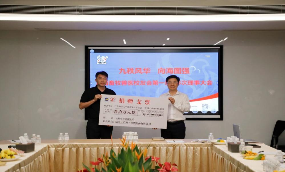 许德贤理事在大会现场向公司捐赠人民币壹拾万元整,许德贤表示:“海大的培养让我们有能力在行业立足,如今回馈母校,是希望能助力更多学弟学妹深耕动物健康食品赛道,为产业输送更多专业人才。”马驿代表公司接受捐赠,并对畜牧兽医员工会长期以来对公司建设的关注与支持致以诚挚谢意。他表示,畜牧兽医员工会架起了员工与母校、企业与行业的桥梁,依托这一宝贵平台,员工们相识相知、结为挚友。员工们同心协力,让社会看到了海大畜牧兽医人的担当,用实实在在的行动为行业发展注入了力量,更让海大的名片愈发鲜亮。时值海大90周年校庆,公司领导走访各地员工,只为诚挚邀请大家重返母校,重温那段青春岁月中真挚的情谊。更希望员工们将这种互帮互助、服务行业、回馈社会的精神,代代相传给师弟师妹们,让海大畜牧兽医人的初心与担当,在薪火相传中愈发坚定。