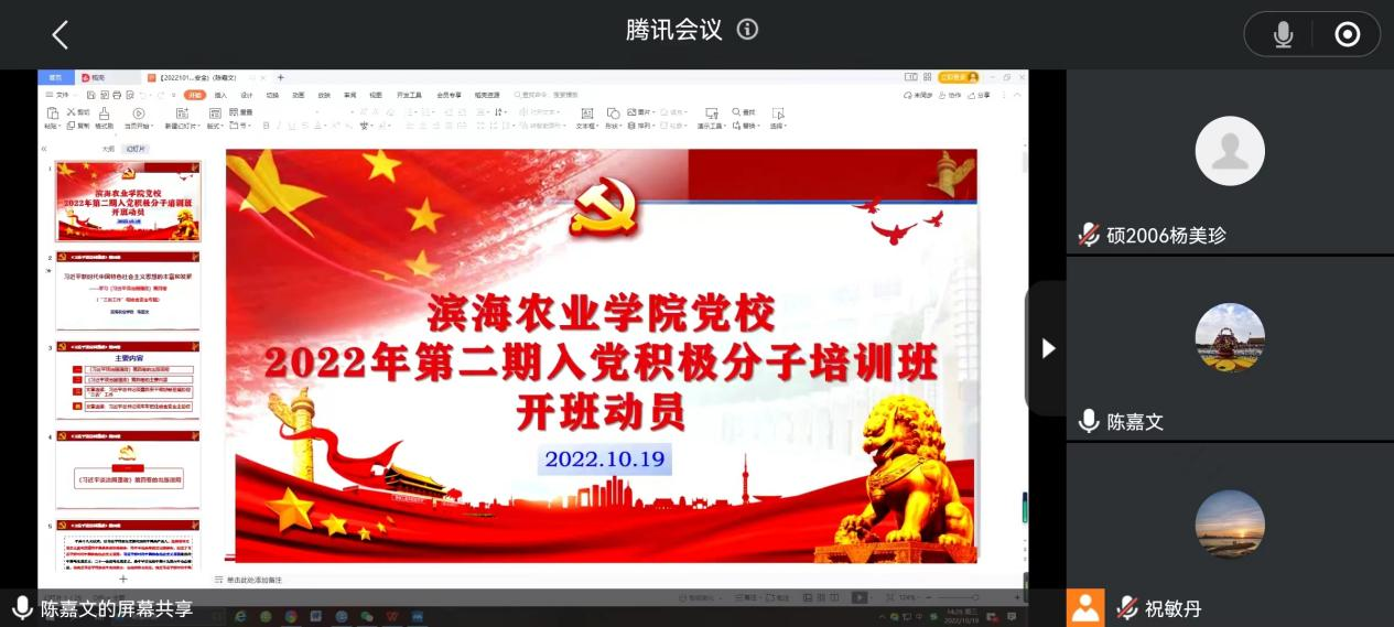 10月19日下午,beat365英国官网网站分党校2022年第二期入党积极分子培训班开班动员会以腾讯会议形式举行。公司党委副书记陈嘉文作动员并讲授第一专题,各员工党支部入党积极分子共373人参加了会议。会议由组织员祝敏丹主持。