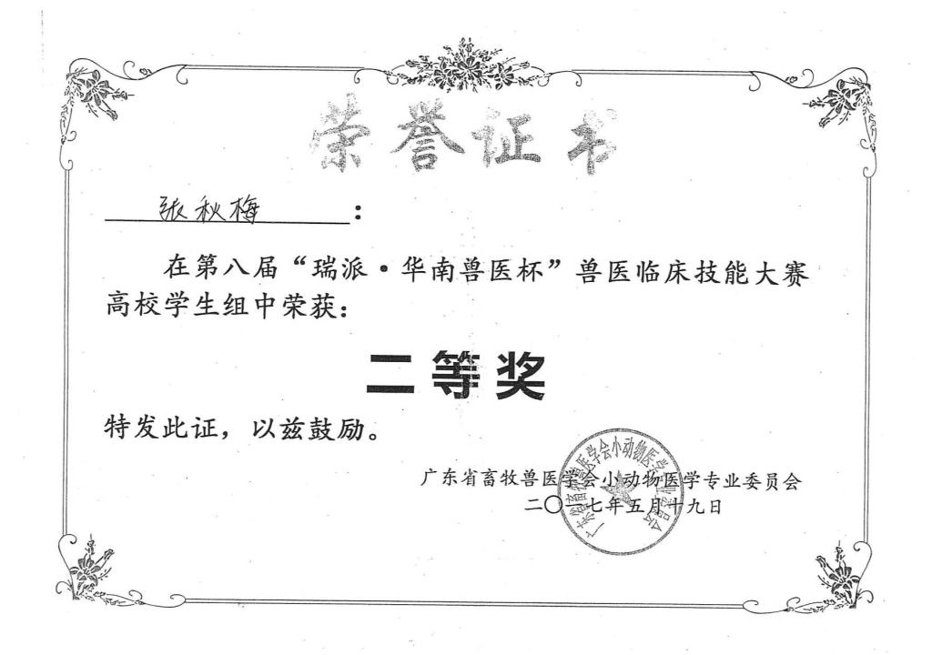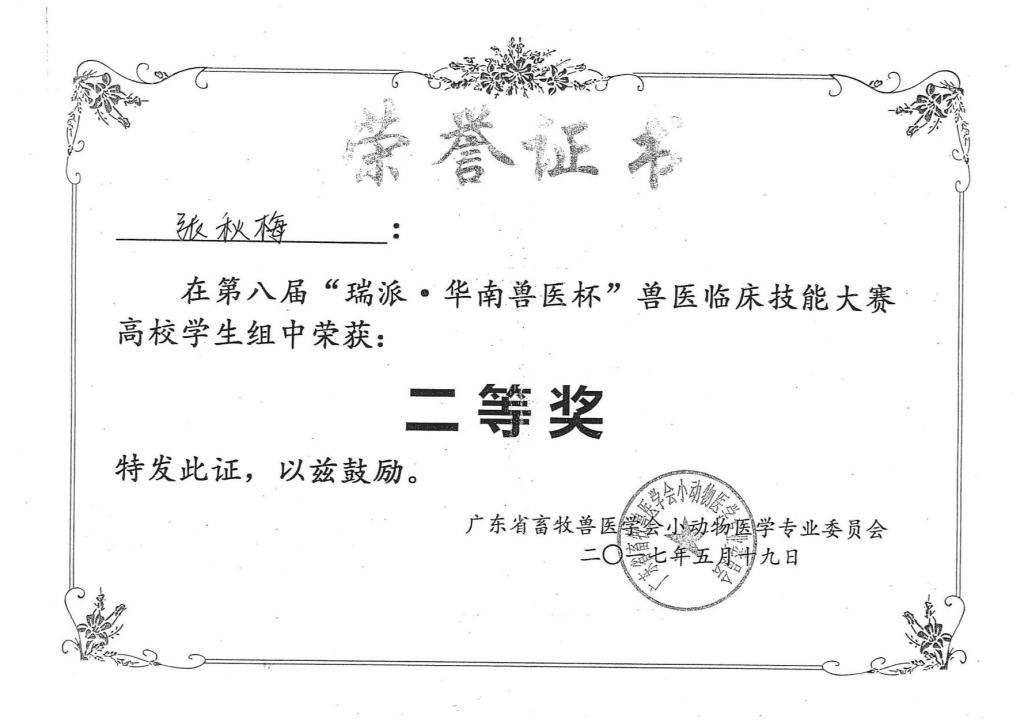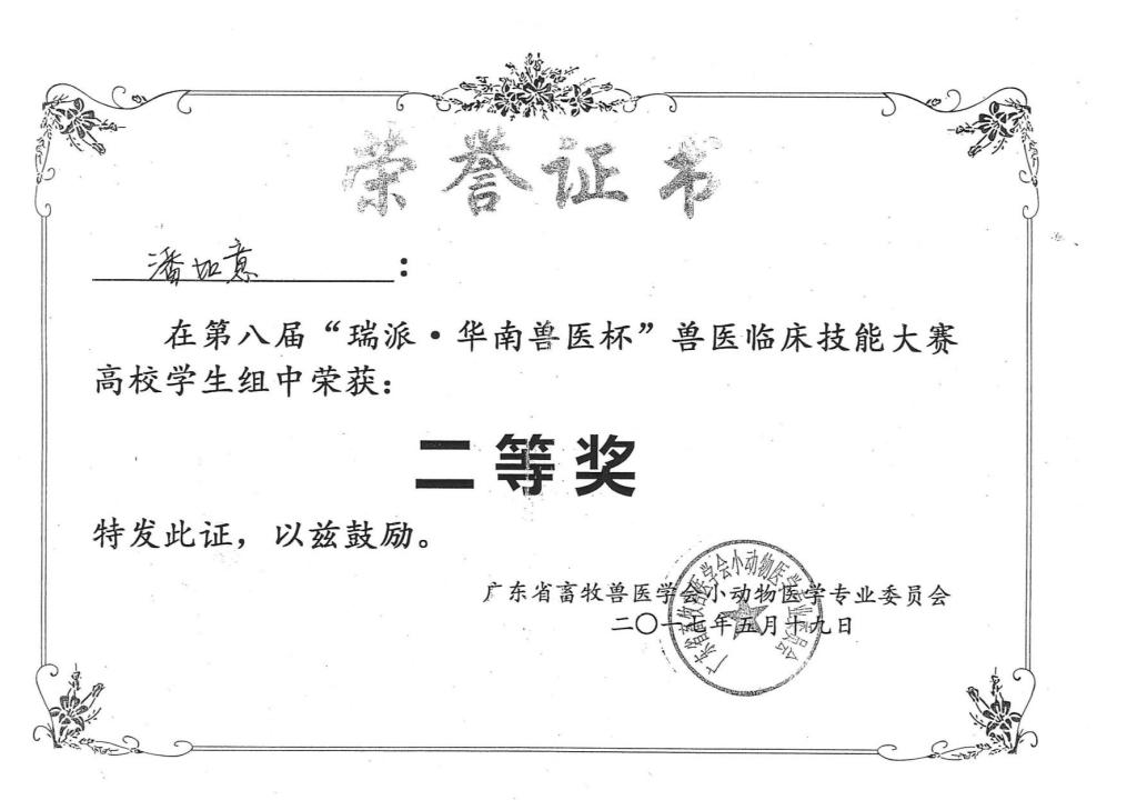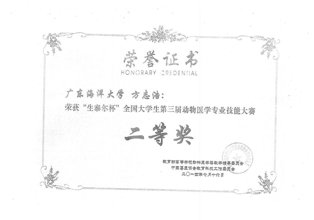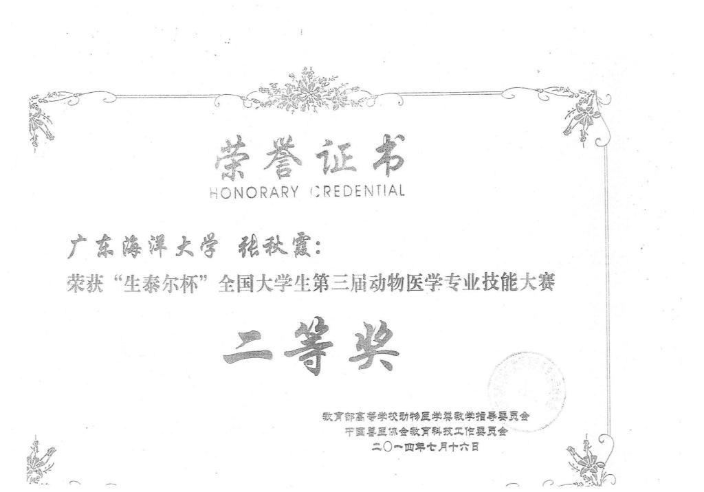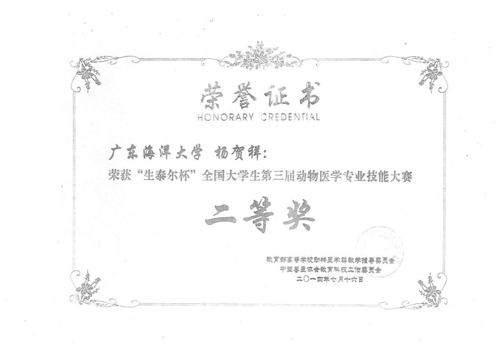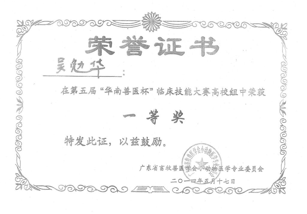 历届“华南兽医杯”“生泰尔杯”专业技能大赛获奖证书